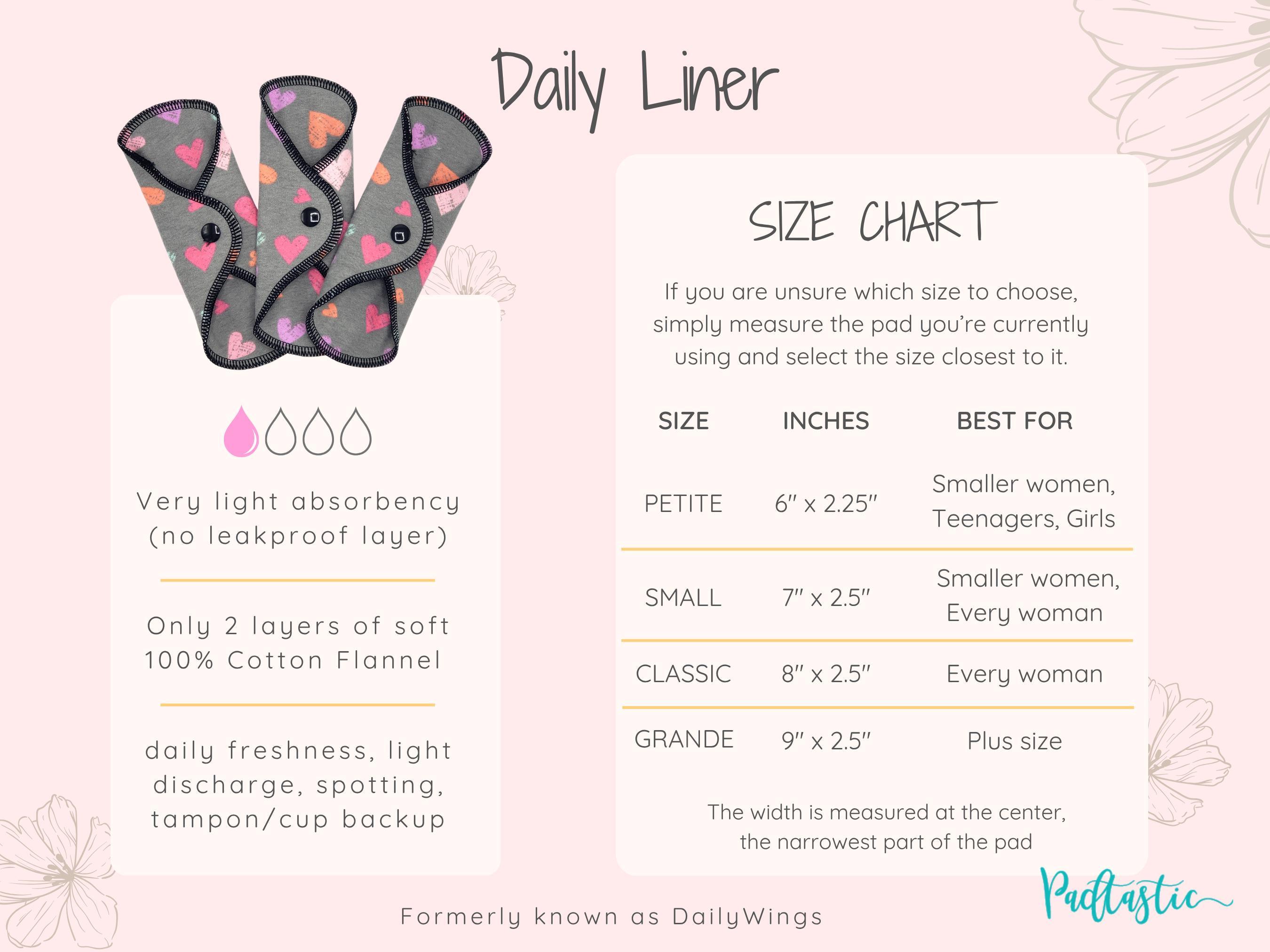 Daily Liners are available in 6”, 7”, 8” and 9”. Have a look at the size chart in the images to find the perfect size for you. If you need help choosing, I am always happy to help 😊